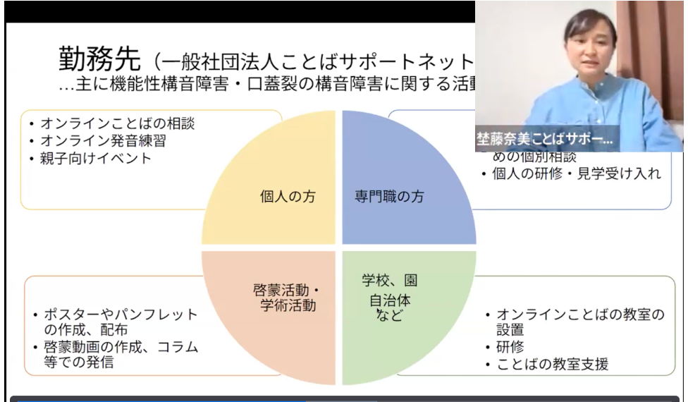 本日のメインイベントは埜藤奈美さん(ことばサポートネット)から『オンラインSTと地域支援』というタイトルで、学校や自治体との連携についてお話しいただきました。